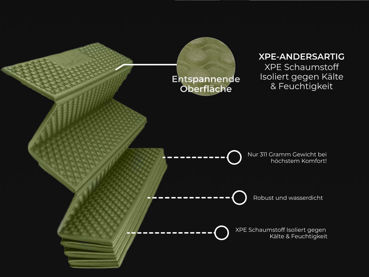 Gefertigt aus widerstandsfähigem XPE-Schaumstoff, bietet die Matte eine gute Dämpfung und schützt zuverlässig vor Bodenkälte und Feuchtigkeit. Die strukturierte Oberfläche sorgt für angenehmen Liegekomfort – auch auf unebenem Untergrund.