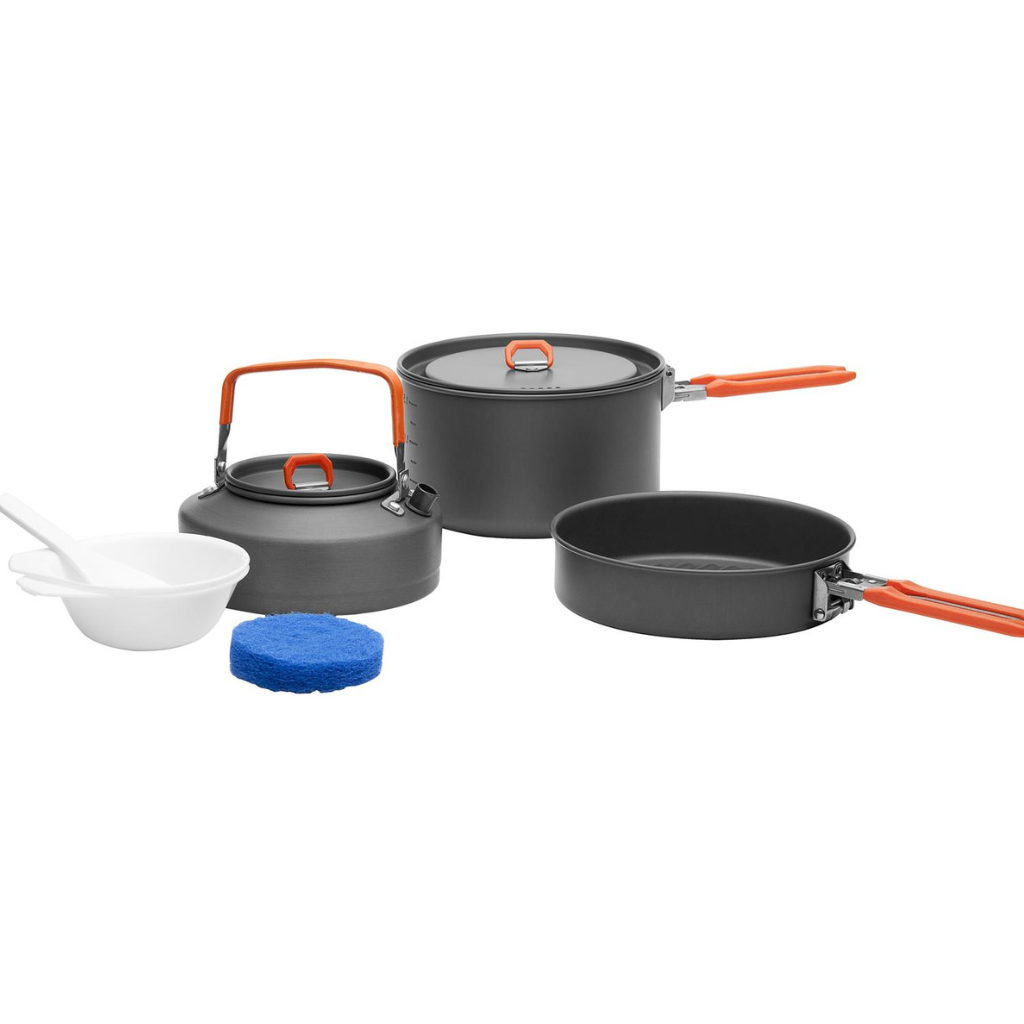 Das Fire-Maple Feast 2 Kochgeschirr-Set bietet alles, was Sie für die Zubereitung von Mahlzeiten im Freien benötigen. Ob beim Camping, Wandern oder Picknick – mit Topf, Pfanne und Wasserkocher sind Sie bestens ausgestattet. Zwei Kunststoffschüsseln, ein Löffel und ein Reinigungsschwamm runden das Set ab.