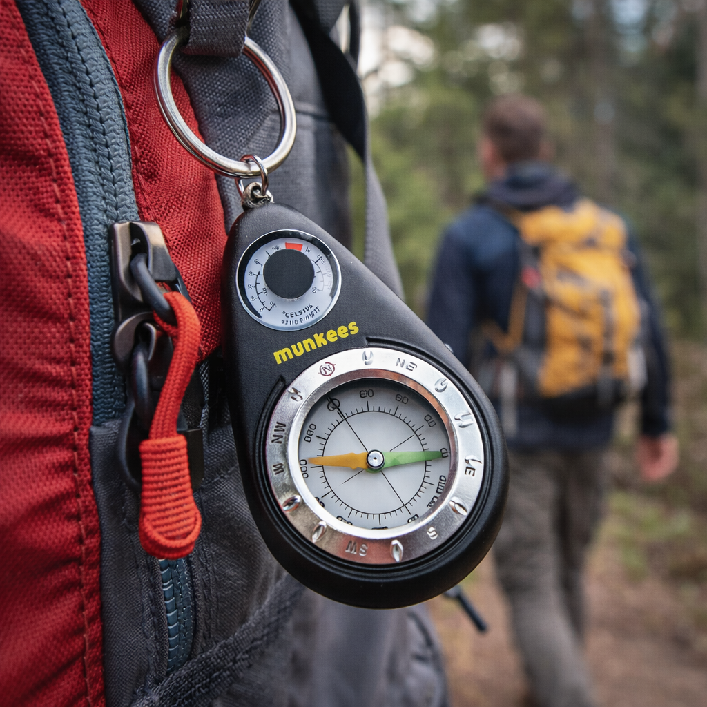 Der munkees Kompass-Schlüsselanhänger mit Thermometer vereint zwei nützliche Funktionen in einem kompakten Format. Ob beim Wandern, Camping oder im Alltag – mit diesem kleinen Gadget haben Sie Orientierung und Temperaturanzeige stets zur Hand.